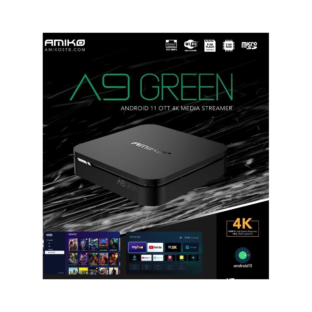 AMIKO A9 GREEN is the perfect choice for a reasonable IPTV/OTT experience at an affordable price. Android 11. AOMedia Video 1.Widevine Level 1. 2GB RAM.8GB FLASH. 4K 60fps HDR10+.